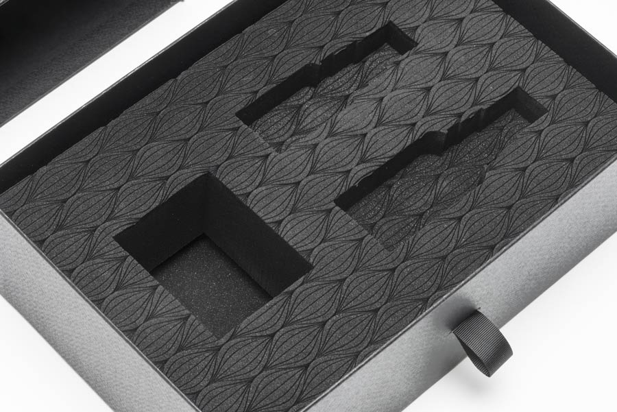 Per l’interno scatola è stato scelto Deep Black Foam, polietilene reticolato a cellule chiuse dall’intenso colore nero, ideale per questa tipologia di packaging dove l’estetica è messa allo stesso livello della protezione. Un gioco di linee incise sulla superficie vellutata circonda gli scassi interni predisposti per i prodotti: un tocco che ha contribuito a donare l’eleganza ricercata dalla committenza. Le ampie possibilità di personalizzazione, grazie dalle svariate tipologie di lavorazione, sono state sicuramente fondamentali nella scelta del cliente, che ha ottenuto un risultato finale in piena linea con le proprie aspettative.