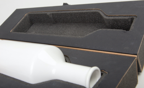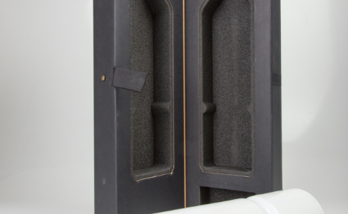 Il pack si compone di due parti complementari in foam di colore nero, inserite in due sagome di cartonato nero unite tra loro “ad effetto cerniera”. Con il taglio ad acqua è stata creata la sede per alloggiare la bottiglia in ceramica “Coulisse”, rispettando la sua forma, dalla particolare scanalatura sulla circonferenza. In una delle due metà è stato realizzato un ulteriore taglio per l’alloggio della scatolina contenente il tappo.